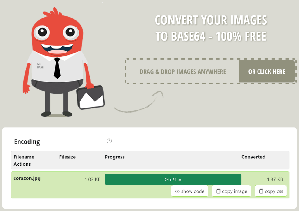 Para convertir una imagen en su representación textual en base64 se recomienda el sitio https://www.base64-image.de/, desde donde se puede realizar la conversión de forma sencilla, simplemente arrastrando la imagen que se quiere convertir y pulsando el botón copy image, para luego pegar el contenido dentro del <script>.