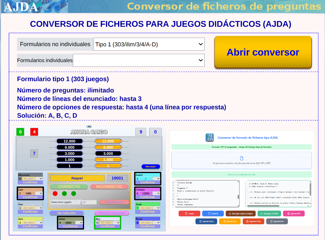 En esta página, al seleccionar el formulario correspondiente al tipo de fichero deseado, se mostrarán sus características junto con una imagen representativa de un juego AJDA de ese tipo y una captura de pantalla del conversor. Al hacer clic en el botón Abrir conversor, se abrirá una nueva ventana con el conversor específico para el tipo seleccionado.