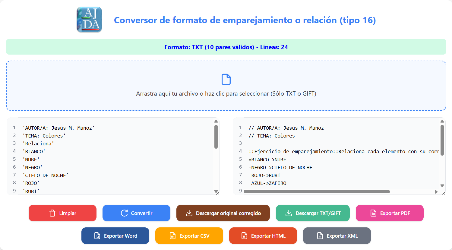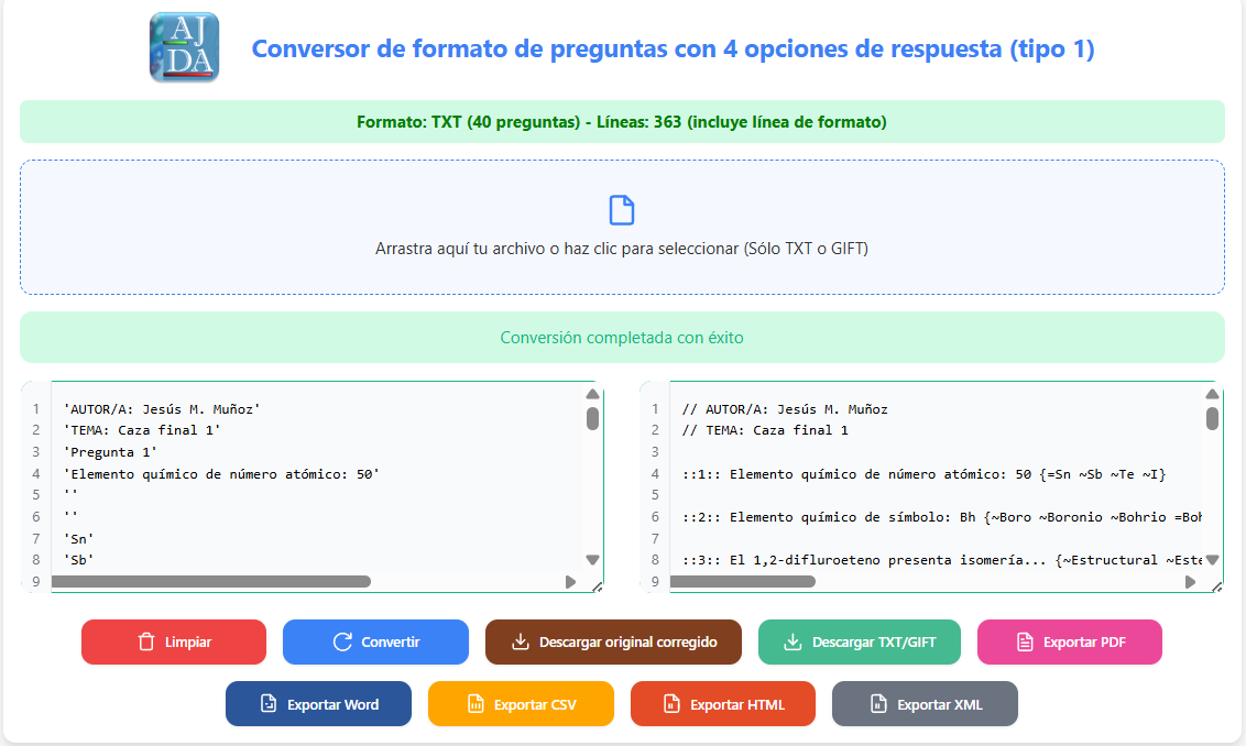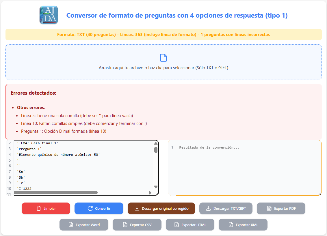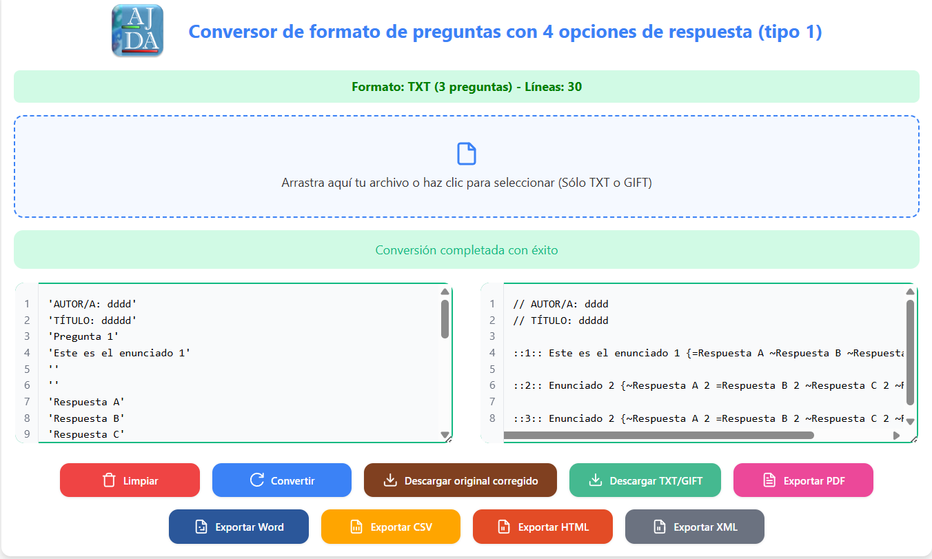 Al presionar el botón Convertir, el archivo en formato TXT de AJDA se transformará al formato GIFT, o viceversa. El resultado de la conversión se mostrará en el campo de texto derecho.