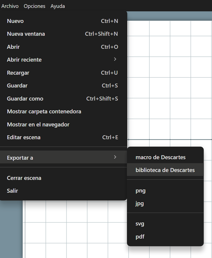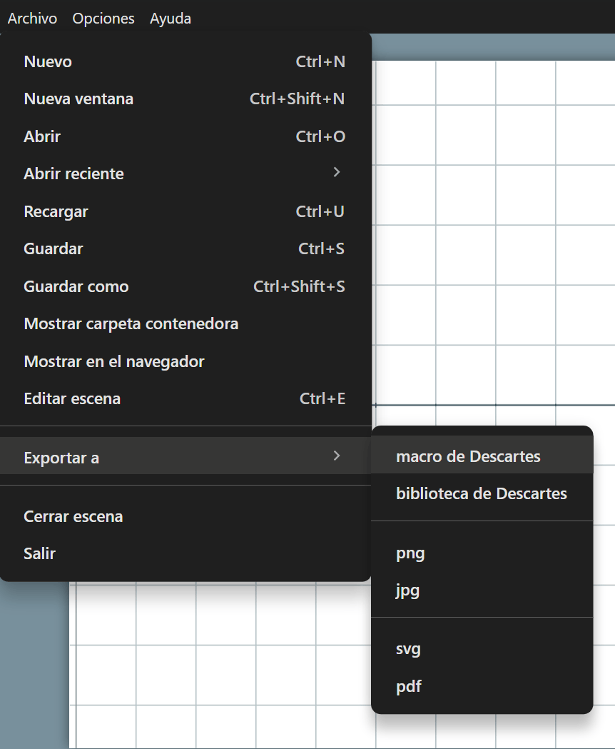Debido a que los macros son elementos más complejos que pueden contener diversos tipos elementos de una escena de DescartesJS, para su creación se recomienda utilizar la opción de exportar una escena a un macro.