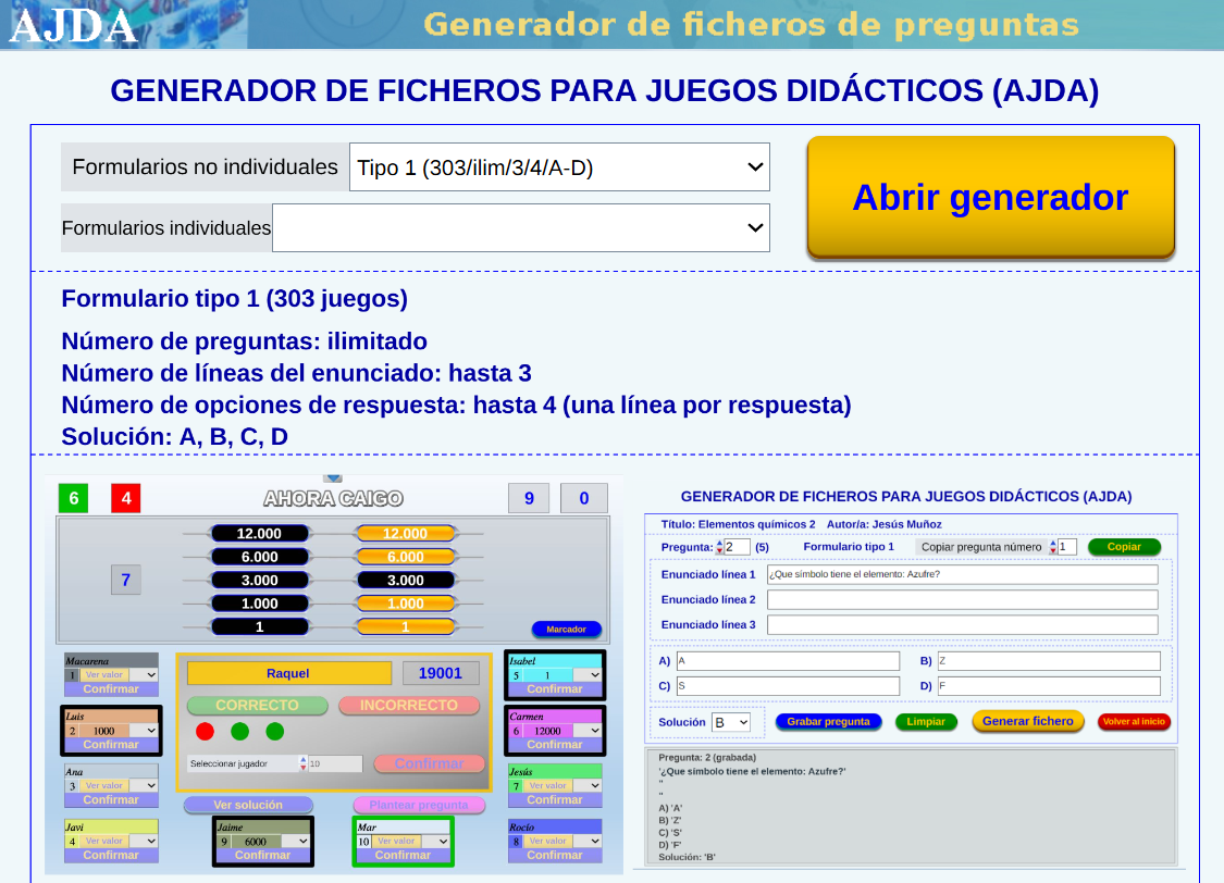 El Proyecto AJDA ofrece un generador de ficheros de preguntas que facilita la creación de contenido de manera sencilla, a través de formularios diseñados específicamente para cada uno de los diferentes tipos de juegos. Estos formularios están optimizados para adaptarse a los distintos formatos de preguntas compatibles con la diversidad de juegos AJDA y para simplificar su elaboración y tratamiento.
