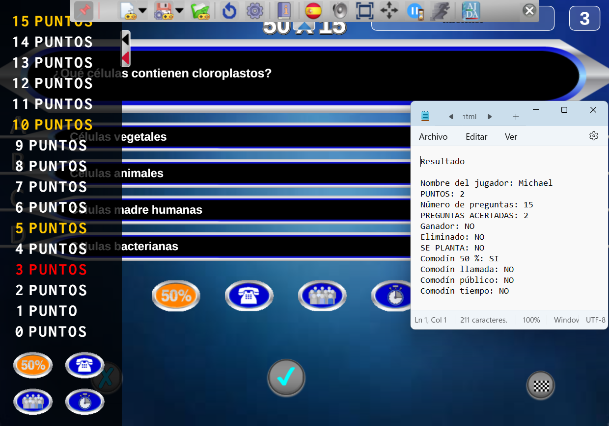 Además, en cualquier momento de la partida se puede generar un fichero de texto con los resultados que se van produciendo en cada momento.