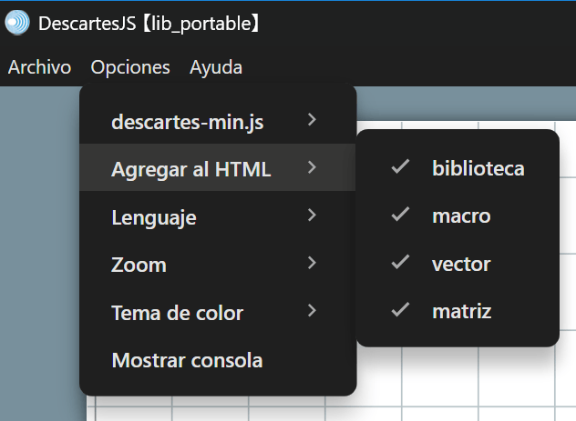 Cuando se activa la opción de agregar una biblioteca al HTML, está se incrusta en la escena agregando un <script> con el tipo type="descartes/library", con el identificador igual a la ruta del archivo de la biblioteca.